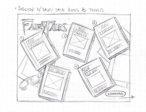 When I thought about fairy tales the first thing that popped into my mind, aside from the classic characters, was children's books. So instead of simply clicking on graphical text in a list to choose your level, I thought it would be fun to see each of the levels presented as fairy tale books. Each book would have a fairy tale character on the cover as well as all of the important level goal information. The player would choose their level by clicking on any one of the decorative books. Below is a thumbnail sketch of what I thought the interface screen would look like. The game logo is in the top left corner, the books are arranged sequentially according to difficulty and there is a spot for navigation buttons on the bottom right.