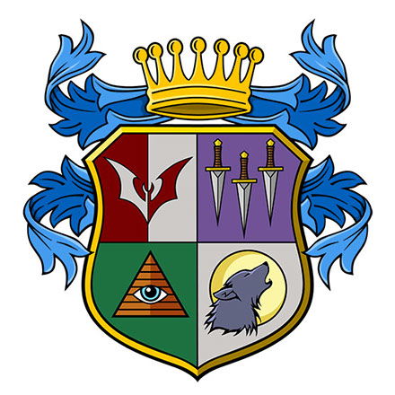 Build-a-lot Mysteries is broken up into four chapters which cover four different members of the Graves family. Over the course of each chapter the player will uncover the true identity of each of the family members, so I felt that I could hint at each family members true identity through the design of the family's coat of arms. The coat of arms depicts a vampire, a sociopath, a psychic and a werewolf. Once the deign was complete, I applied an alpha mask of a linen texture to it and the combined image was applied to a mesh primitive in Maya and rendered out.
