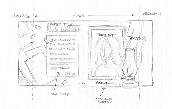 Below is a sketch of the layout for the introduction screen interface. It was decided that the right side of the interface would be the same in every episode and show Elizabeth, a glowing lamp, and a tapestry of the family crest, while the left side of the interface would contain episode specific clue items and story details. The graphic was designed to keep all relevant information contained within a 1024x768 image area, but allowed more of the image to be viewed by players in widescreen.