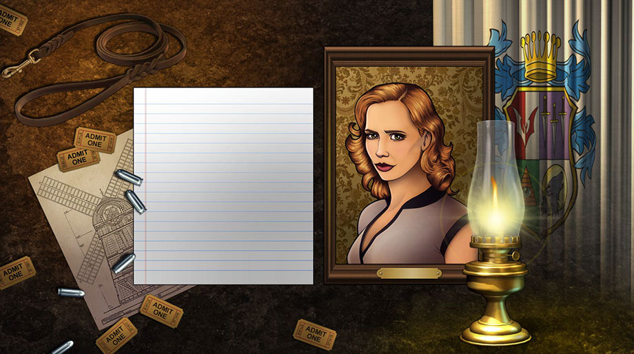 Final Interface Design and Illustration Here is the final Illustration in widescreen. The background textures are comprised of distressed wood and stained concrete , the silver bullets, lamp and tapestry are rendered in Maya and the drawings, leash, fair tickets and character portrait are hand illustrated. The finished images were assembled in Photoshop and adjusted for color, levels and lighting.