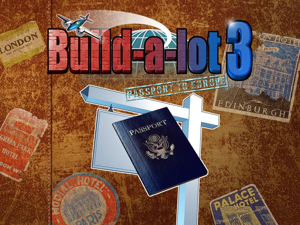 I wanted the Build-a-lot 3 Passport to Europe logo to have a well worn, old world look and feel to it. I textured the font with hand made brick, acquired a collection of vintage and royalty free European travel stickers and placed them on top of a heavily distressed leather background that made the logo resemble an old suitcase. Build-a-lot 3 Passport to Europe Game Logo