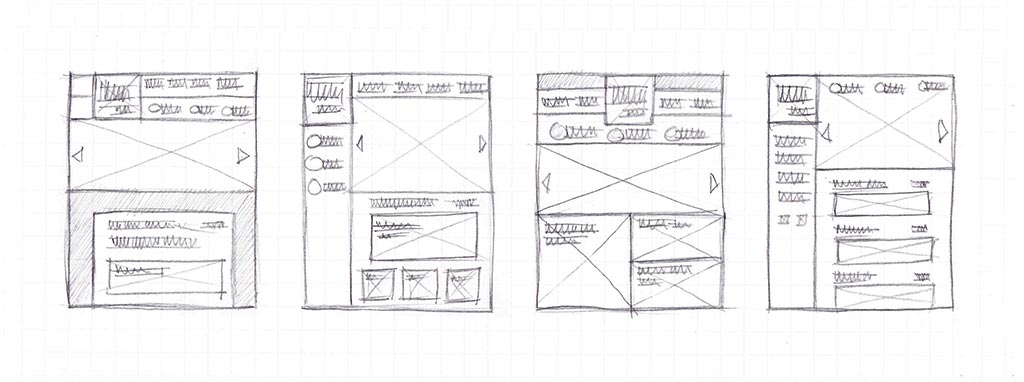 These are a few examples of thumbnail sketches for the home page. It was decided early on that the navigation bar would be broken into two groups. The top section of the bar would contain the basic site navigation links, while the bottom part would have branded links that the user could use at any time to access the company's most valuable properties (Build-a-lot, Flip Words and Puzzle Express).