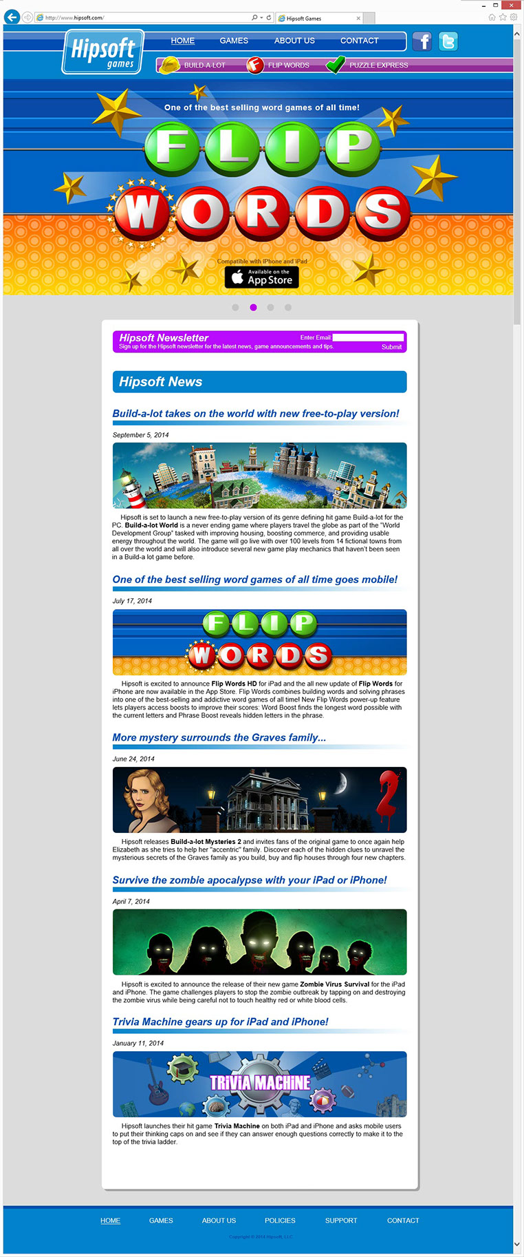 Game Properties Landing Page Headers All titles were grouped by platform in "Pods" on the Games Page, however each of the company's three most popular properties (Build-a-lot, Flip Words, Puzzle Express) had their own landing pages so that customers and potential business partners could learn more about those properties and see all of the games in that product line together on one page.