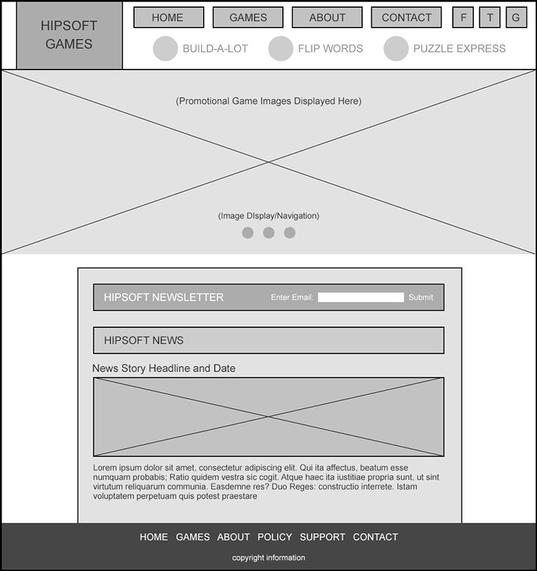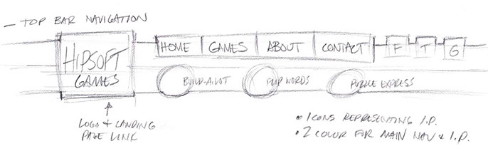 HipSoft Website Design The goal of this project was to design a website that showcased the latest Hipsoft games and most valuable Intellectual Properties to customers and potential business partners, while also making news items and the back catalog of games easily accessible. The site needed to be simple to navigate and have a clean and colorful aesthetic that was fun to look at and related well to other successful casual and mobile game companies. My duties and responsibilities on this project included designing the look and feel of the site, creating the site diagram, sketching and wireframing each of the pages, completing all of the final art assets and writing the copy. All artwork was created using Adobe Photoshop and Adobe Illustrator and the site was constructed using Adobe Muse. Thumbnails and Sketches